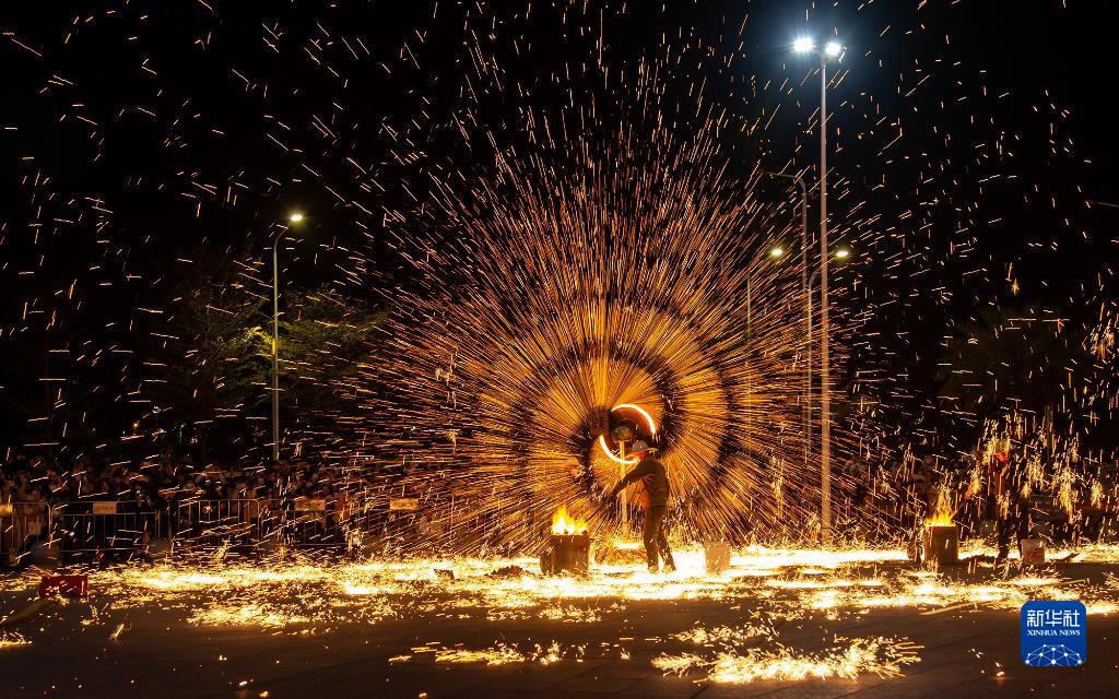 当晚,广东省揭阳市上演了一场精彩的“打铁花”非遗表演活动,吸引了大量市民和游客前来观赏,营造出浓郁的节日氛围。