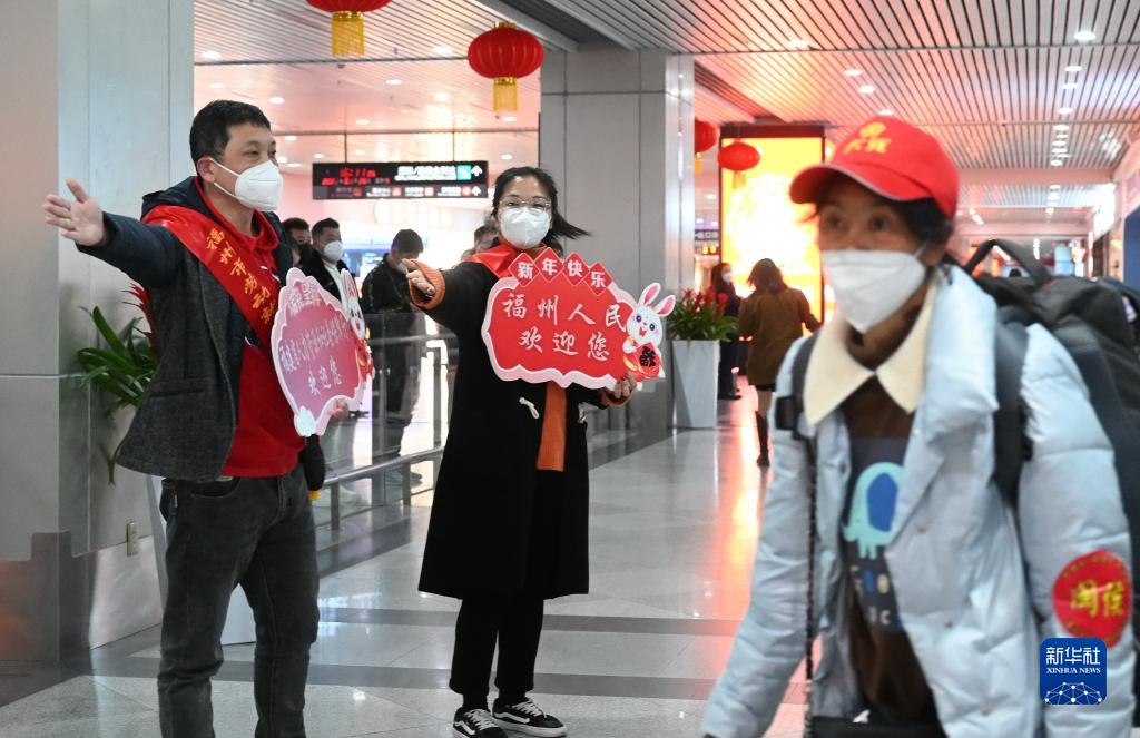 1月26日,工作人员在福州长乐国际机场引导返岗务工人员。
