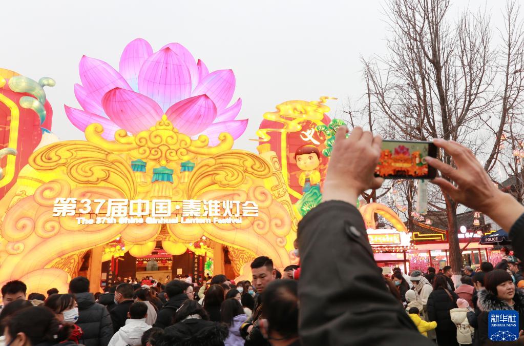 1月26日,游客在南京夫子庙秦淮灯会拍照。