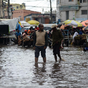 1月25日,在马达加斯加首都塔那那利佛,行人走过积水的道路。