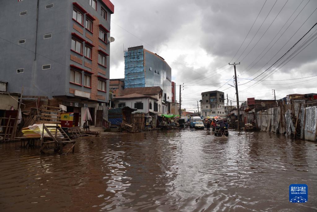 1月25日,在马达加斯加首都塔那那利佛,暴雨过后道路被积水淹没。