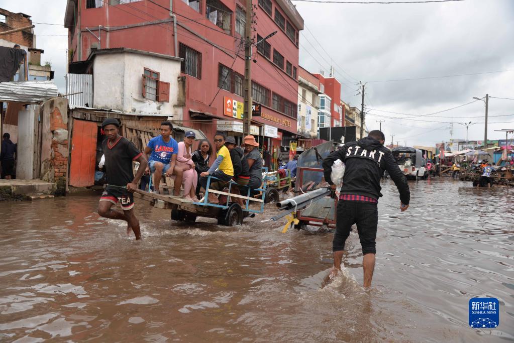 1月25日,在马达加斯加首都塔那那利佛,行人走过积水的道路。