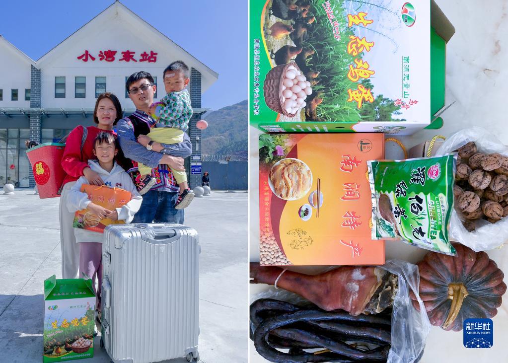 拼版照片:左图为云南省大理白族自治州南涧彝族自治县小湾东镇纸房村人兰云娅(后左一)一家提着行李在小湾东站候车,准备返回昆明(1月26日摄)。从前,从小湾东镇到昆明需要一天一夜,现在乘高铁只要3个小时就能到达。右图为兰云娅一家即将装进行囊里的物品(1月26日摄),有父母亲手腌制的腊肉香肠、南涧土特产生态土鸡蛋、南涧锅巴油粉和茶叶等。