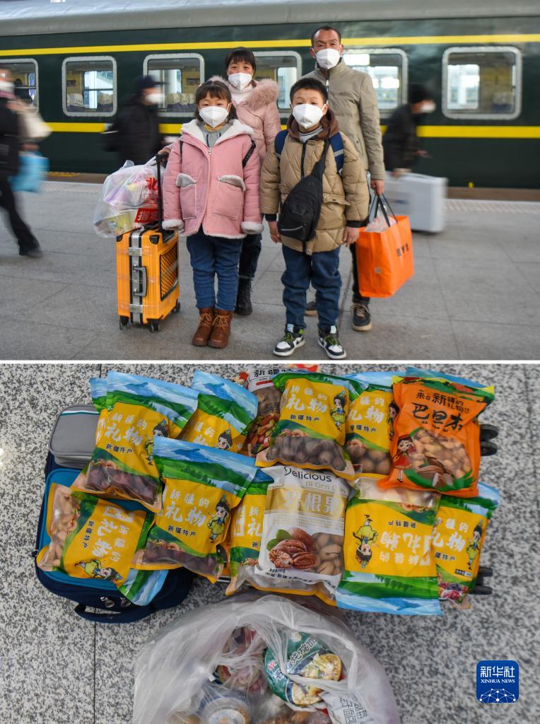 拼版照片:上图为嫁到甘肃省岷县的新疆呼图壁县人汪元芳(后左一)一家在新疆乌鲁木齐站准备乘坐火车前往甘肃。时隔两年,汪元芳带着全家人回到新疆呼图壁县,在娘家度过2023年的春节(1月26日摄)。下图为汪元芳一家行囊里装的物品。除了在火车上的吃食外,汪元芳的父母还给他们装了葡萄干、核桃、大枣等新疆特色干果(1月26日摄)。