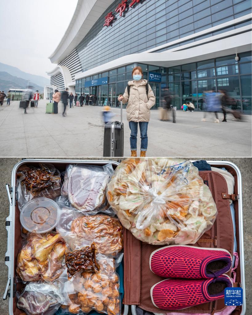 拼版照片:上图为重庆市巫溪县花台乡花台村人刘明兴在奉节站候车,准备去往重庆主城上班(1月26日摄)。刘明兴在重庆主城已工作了8年,因为各种原因已经两年没能回老家过春节,今年专门回家陪家人一起过节。下图为刘明兴行囊里装的物品(1月26日摄)。除了自己带的衣物外,刘明兴行囊里装满了家人给准备的土鸡、腊肉、自制的牛肉干和母亲为她亲手钩织的棉鞋等物品。