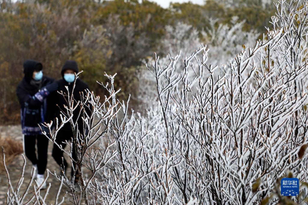当日,湖南省资兴市回龙山景区现雾凇现象,山中树木银装素裹,吸引游人纷至沓来。