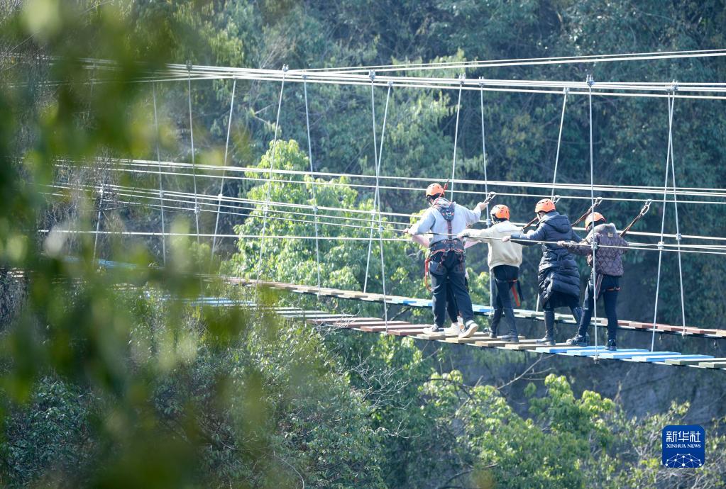 春节假期,人们前往地处鄂西山区的宣恩县锣圈岩地质公园,体验天坑上空行走、深入洞穴探险等,学习地质知识,挑战自我,乐享户外休闲的乐趣。