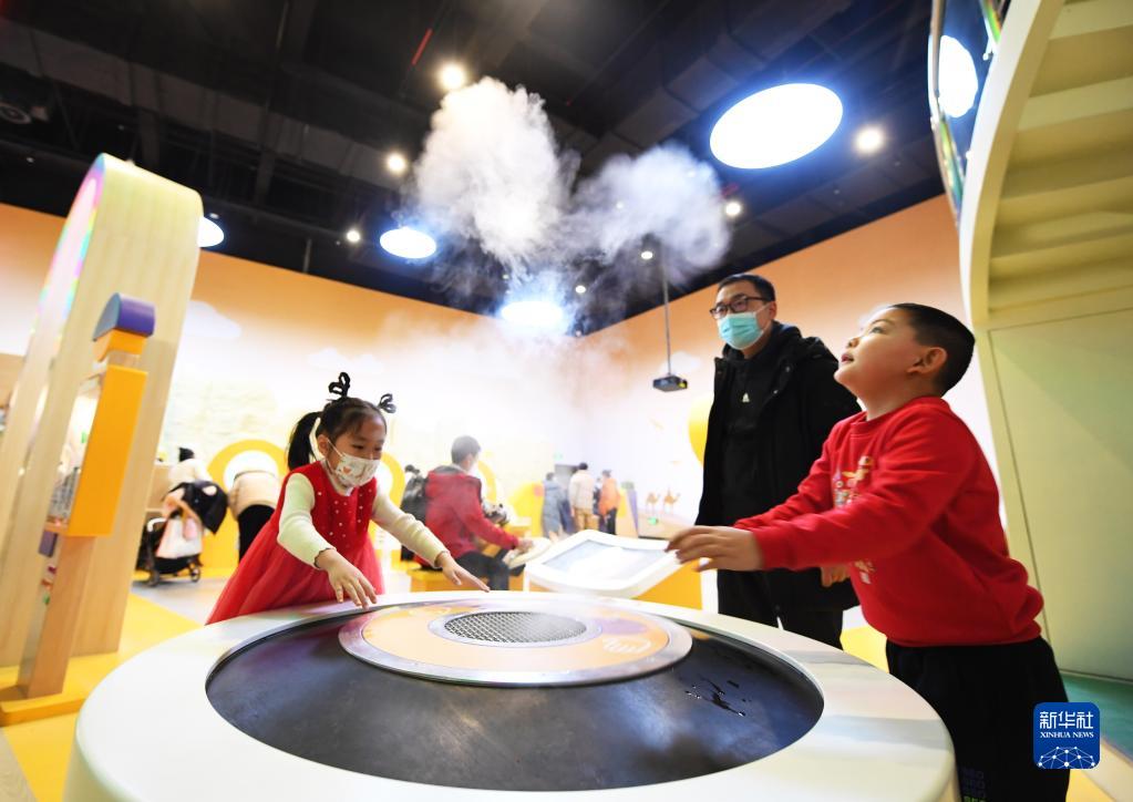 1月27日,小朋友在河南省科技馆新馆“童梦乐园”展厅体验科技项目。