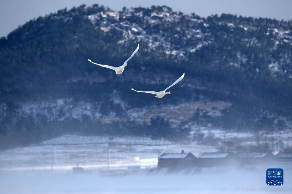 近日,山东荣成出现降雪。在荣成天鹅湖,大天鹅迎风戏雪,翩翩起舞。