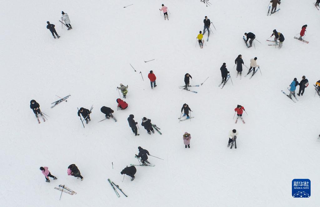 1月26日,游客在江苏淮安一滑雪场滑雪(无人机照片)。