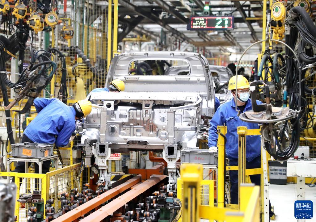 1月28日,工人在上汽通用五菱青岛分公司的生产车间进行焊接作业。