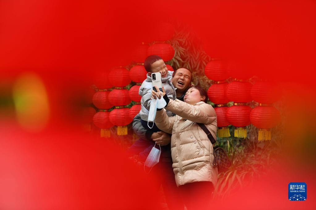 1月25日,游客在贵州省贵阳市云岩区黔灵山公园“爽爽贵阳”首届春节大型市集庙会上拍照留影。