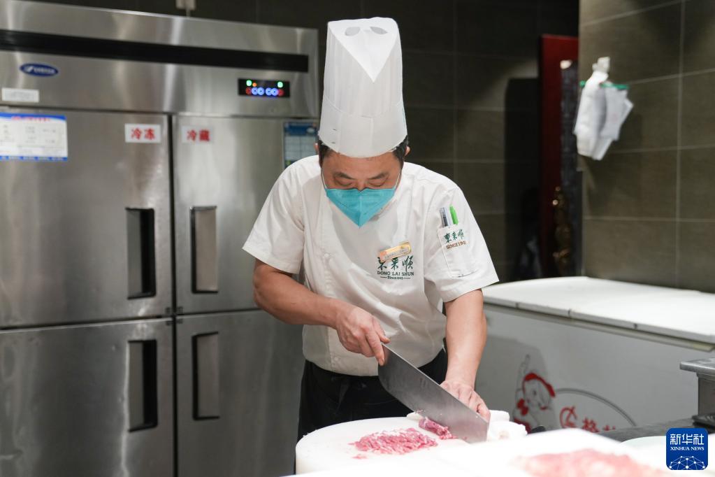 1月28日,在北京东来顺饭庄总店,厨师冯炳山在切节后开工第一天的第一盘鲜羊肉。