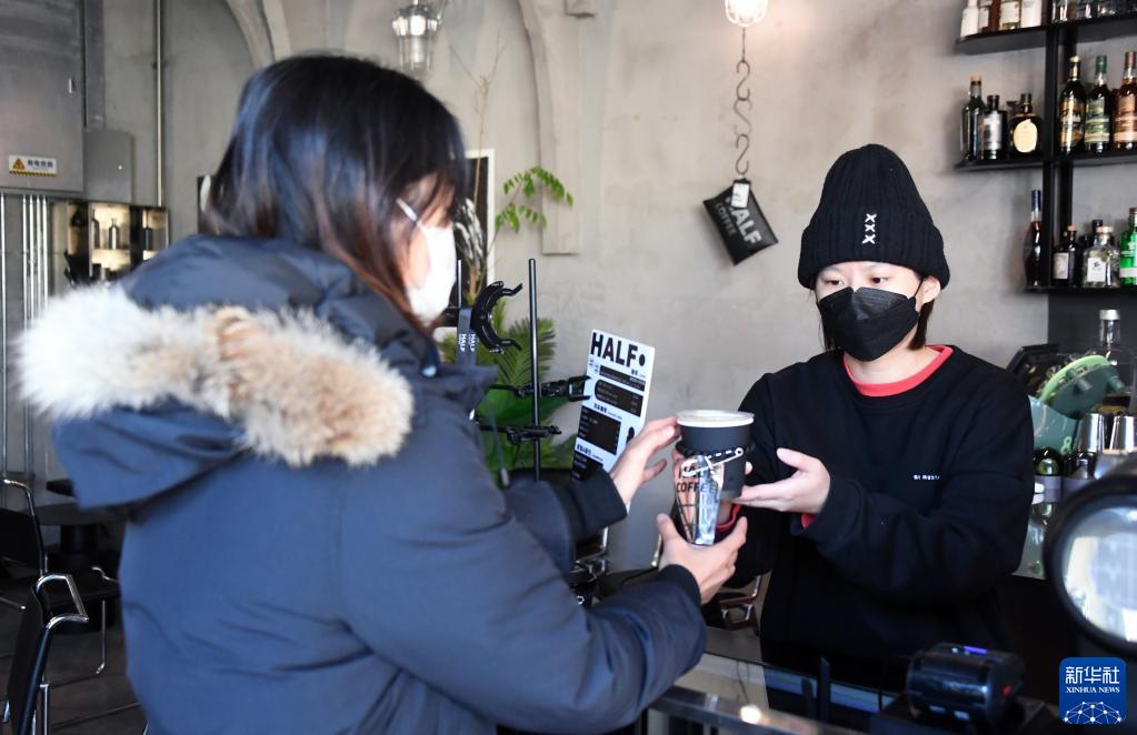 1月28日,在北京市东城区隆福文创园的一家咖啡店,主理人璐琪(右)将制作好的兔年开工第一杯咖啡交给顾客。