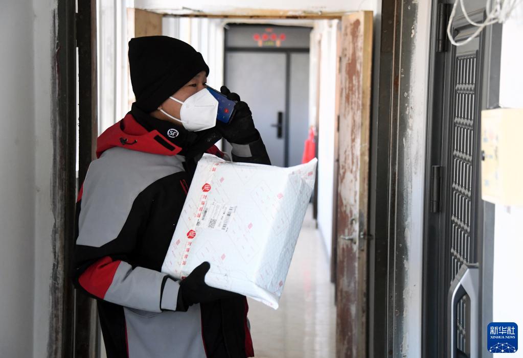 1月28日,顺丰速运快递员杨敬山在北京市海淀区中关村街道希格玛社区的一座住宅楼内送兔年开工第一单快件。