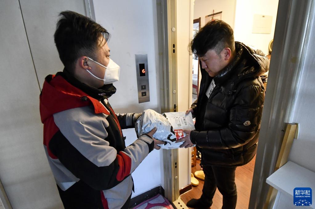 1月28日,顺丰速运快递员蒋双建在北京市朝阳区青年路某社区送兔年开工第一个工作日的第一单快递。