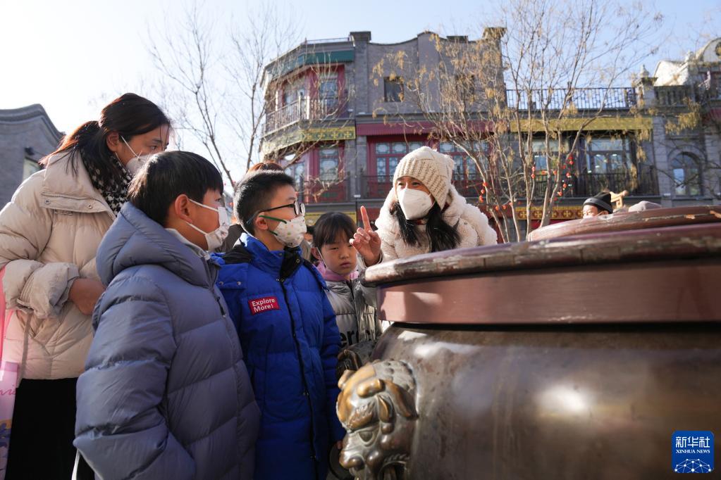 1月28日,在北京市前门大街,导游何静(右一)在为游客讲解。