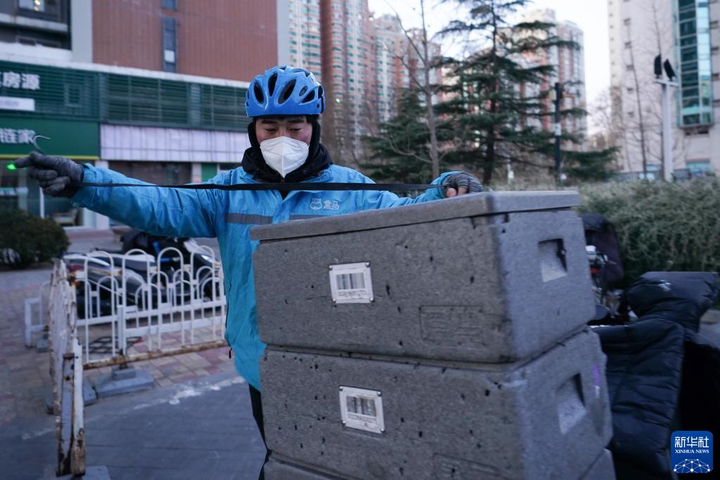 1月28日,在盒马鲜生北京十里堡店,配送员侯殿彬在打包固定要配送的第一单商品。