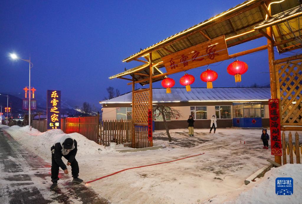 吉林市永吉县北大湖镇南沟村村民邵锋在自家经营的乐雪之家民宿门口与雪友一起放鞭炮(1月21日摄)。新华社记者 颜麟蕴 摄