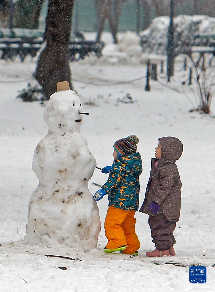 1月28日,孩子们在罗马尼亚布加勒斯特的一处公园玩雪。