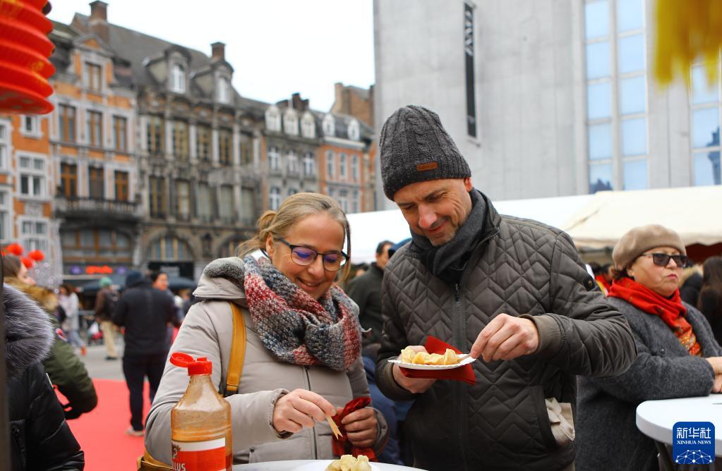 1月28日,人们在比利时纳慕尔品尝中式小吃。