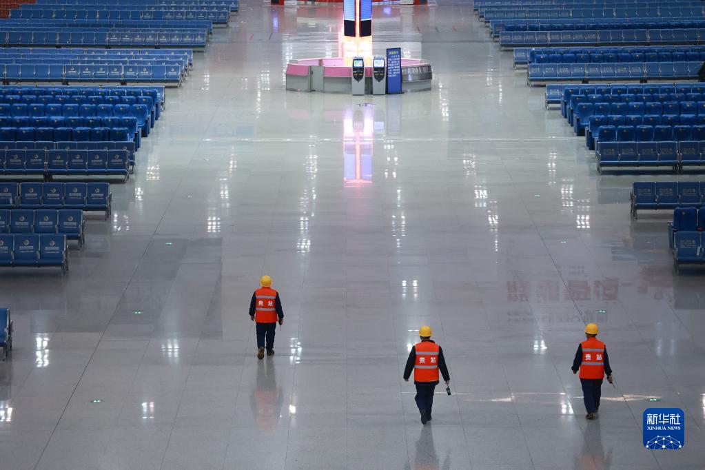 1月29日,工作人员走在空无一人的贵阳北站候车大厅内。