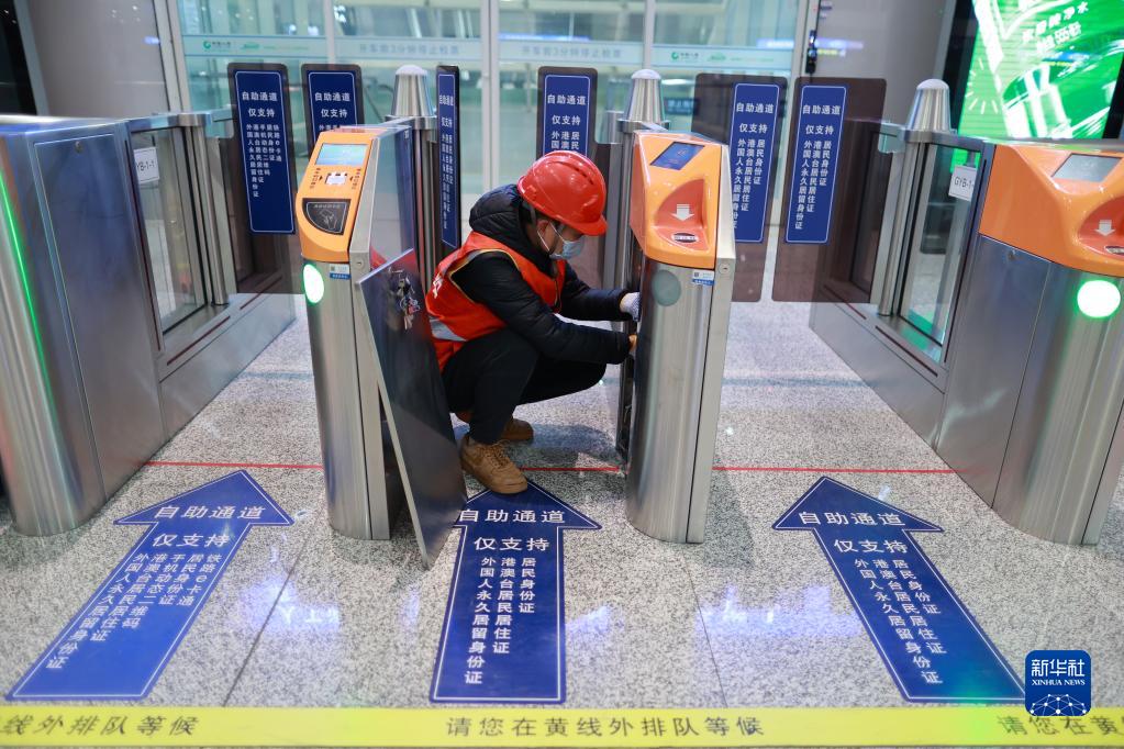 1月29日,设备检修人员在贵阳北站检修进站闸机。