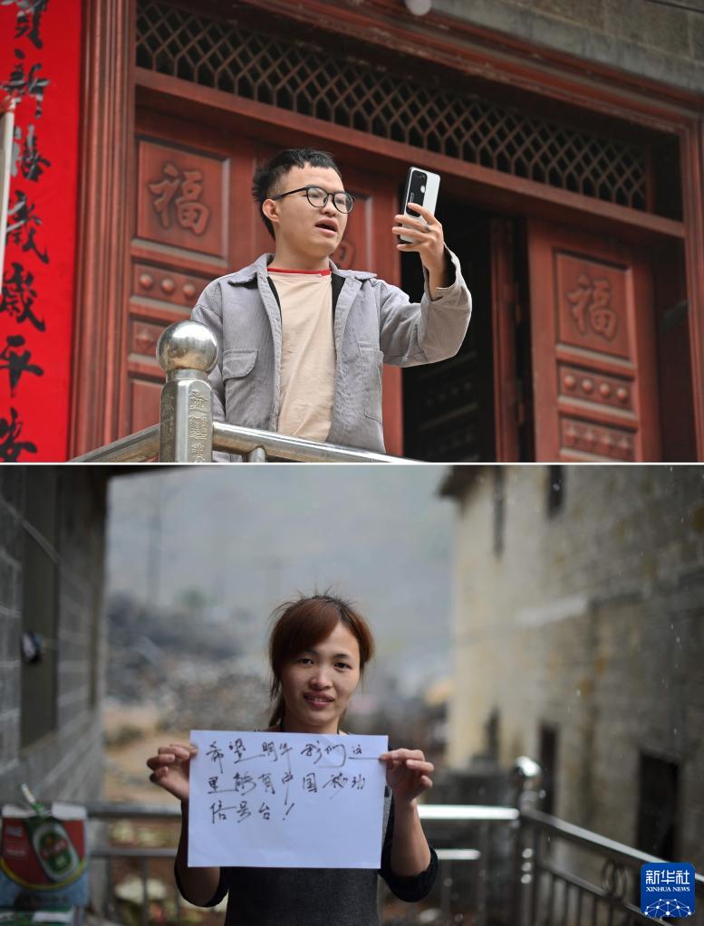 拼版照片:上图为2023年1月26日,弄勇村弄顶屯村民蓝志龙和远在湖南的姐姐蓝春梅进行视频通话;下图为2015年2月14日,蓝春梅写下新年愿望——希望手机信号强一点。