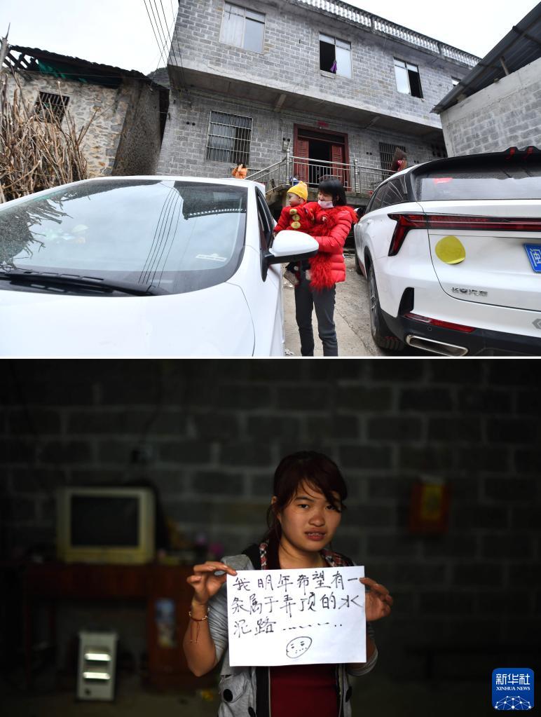 拼版照片:上图为2023年1月15日,弄勇村弄顶屯的水泥路已通到家家户户门口,村民蓝春花将汽车停在家门口;下图为2015年2月14日,蓝春花写下新年愿望——希望弄顶屯通水泥路。