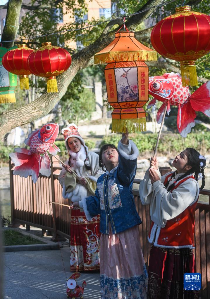 1月29日,在嘉兴市秀洲区新塍古镇小蓬莱公园内,身着传统服饰的游客在“鳌山灯会”现场观赏花灯。