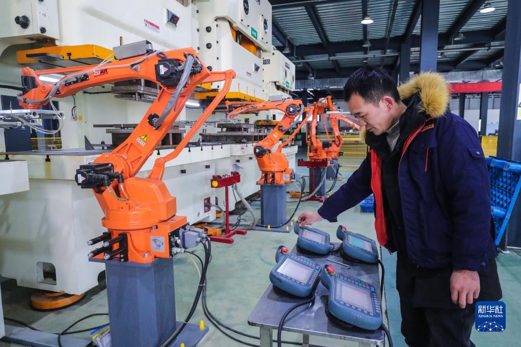 1月29日,在河南省信阳市光山县三元光电科技扶贫车间内,工人操作机器人赶制新年订单产品。