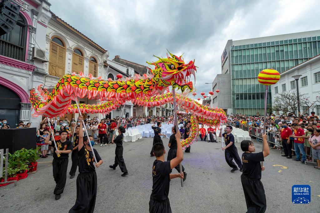 这是1月28日在马来西亚槟城州首府乔治市举行的槟城庙会上拍摄的舞龙表演。