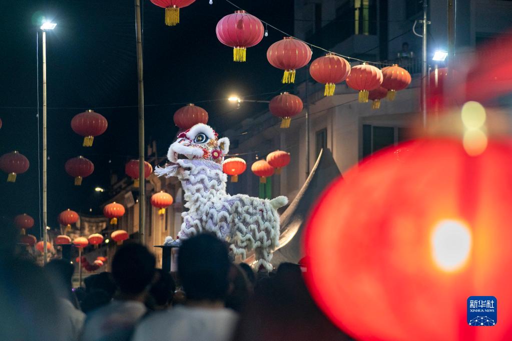 这是1月28日在马来西亚槟城州首府乔治市举行的槟城庙会上拍摄的舞狮表演。