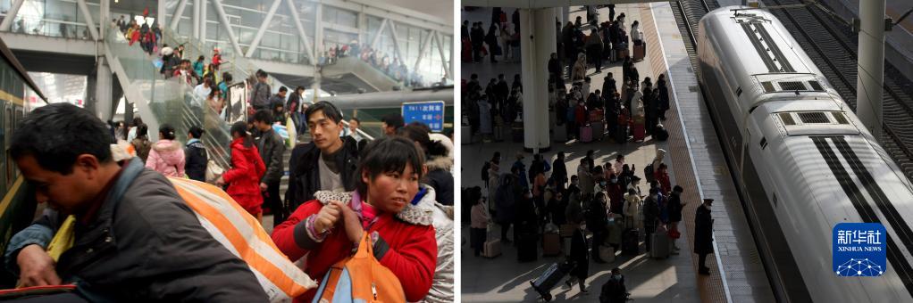 拼版照片:左图为2009年1月30日,旅客在阜阳火车站乘车;右图为2023年1月27日,旅客在阜阳西站乘车。