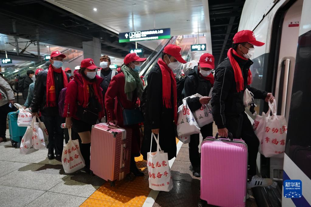 当日,来自云南省多地的370多名务工人员在昆明南站免费搭乘动车前往广东返岗务工。近年来,云南省努力实现“两需求一畅通”,将农村劳动力返岗就业需求与企业用工需求无缝对接,畅通群众“从家门到厂门”返岗就业通道。