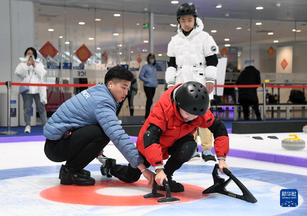 1月29日,小朋友(前右)在“冰立方”冰上运动中心练习冰壶基础动作。