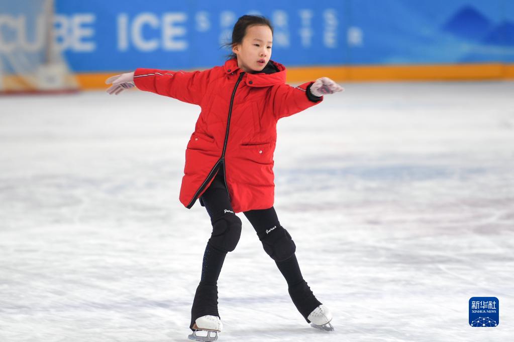 1月29日,一名小朋友在“冰立方”冰上运动中心滑冰。