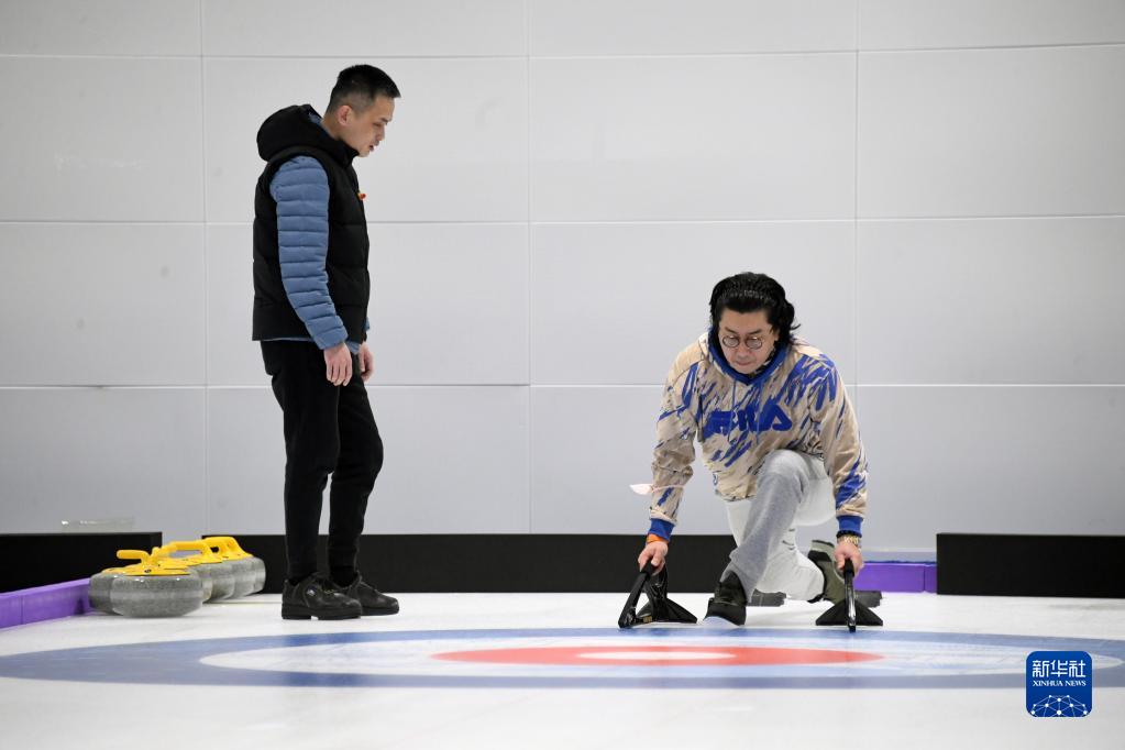 1月29日,游客(右)在“冰立方”冰上运动中心练习冰壶基础动作。