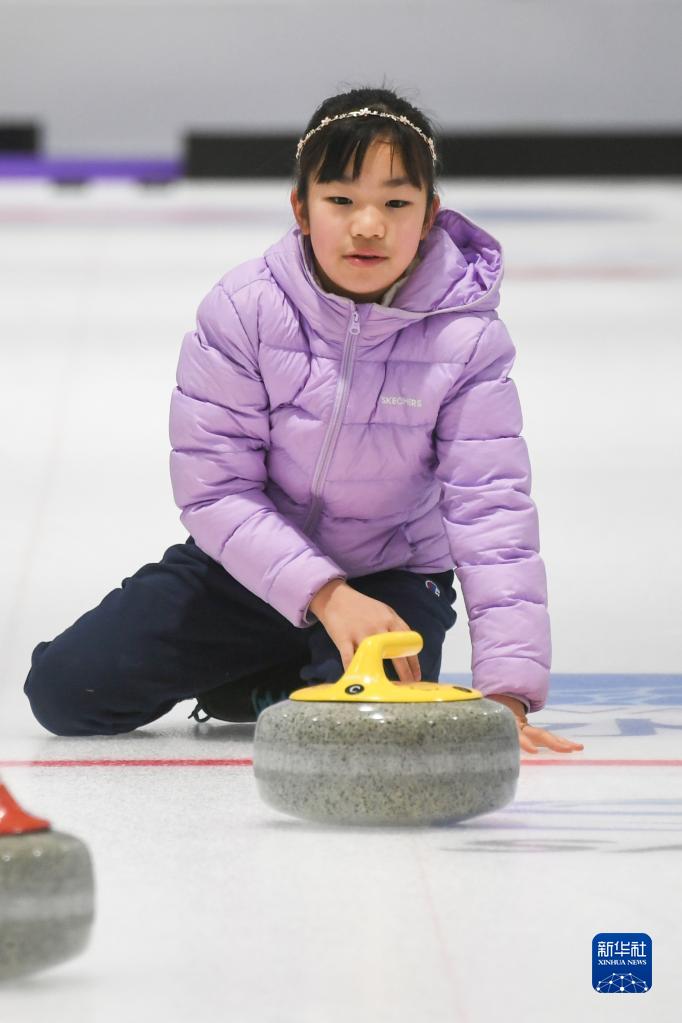 1月29日,一名参加冰壶专业培训班的小朋友在“冰立方”冰上运动中心练习投壶。