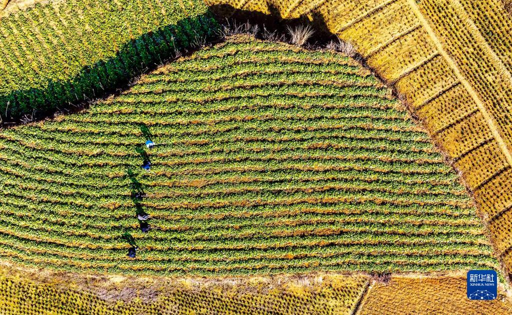 1月30日,村民在贵州省黔西市莲城街道老鸹河社区地里劳作(无人机照片)。