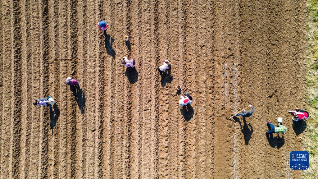 1月30日,在浙江省金华市金东区澧浦镇上宅村马铃薯种植基地,当地农民在进行新品种马铃薯播种(无人机照片)。