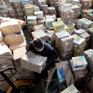 1月30日,在湖南省永州市道县新华书店仓库,工作人员在搬运教材。