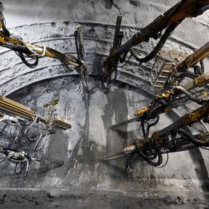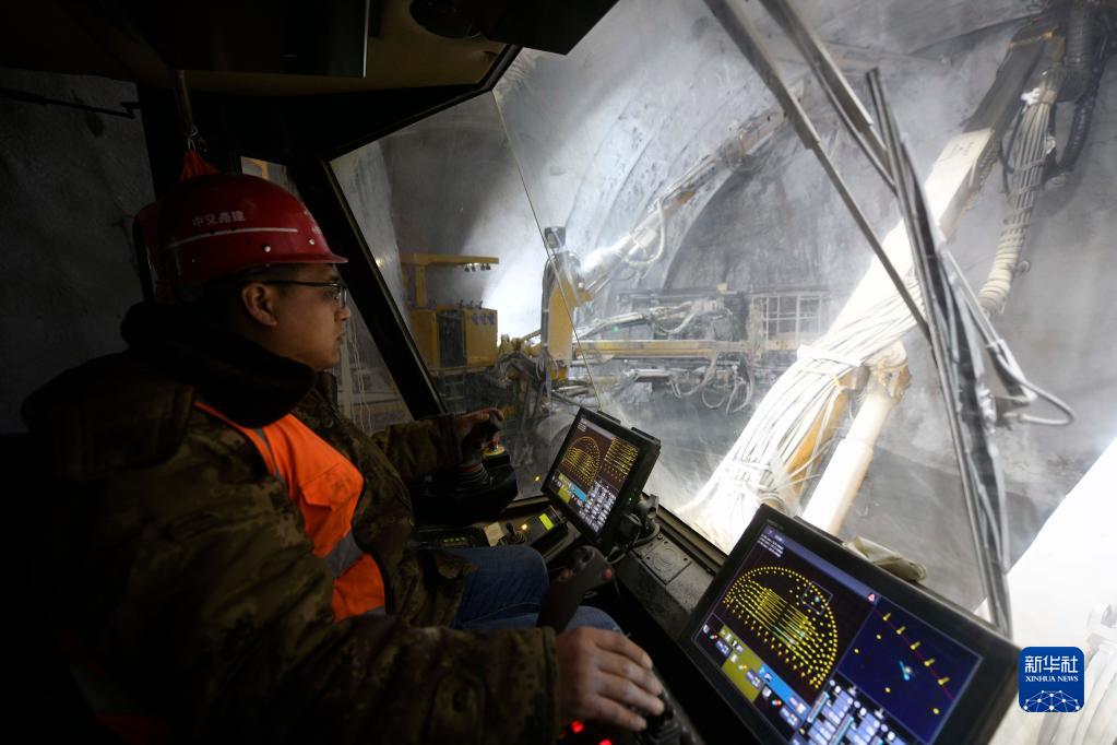 1月30日,在首都地区环线高速公路承德至平谷段杨家窝铺特长隧道施工现场,工人操作机械进行钻孔。