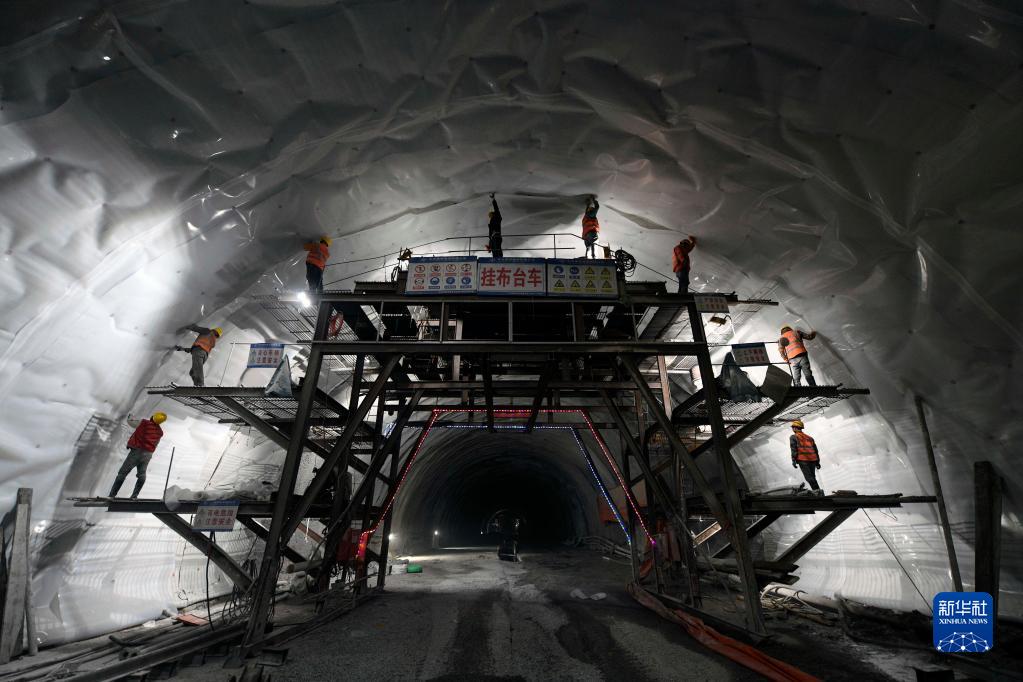1月30日,在首都地区环线高速公路承德至平谷段杨家窝铺特长隧道施工现场,工人在铺设防水板。