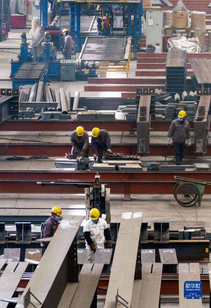 1月30日,在山西运城一家建筑公司的轻钢车间,工人在进行焊接拼装作业。