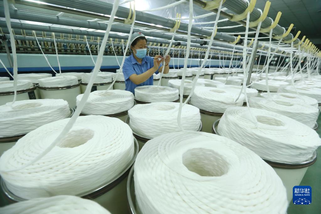 1月30日,山东省青岛即发盛宝纺织有限公司的纺织工人在智能化生产线上生产棉纱产品。