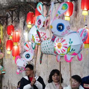 兔年新春,在安徽省黄山市黟县宏村,当地举行的花灯研习班邀请游客共同制作兔子形状花灯。傍晚时分,五颜六色的“兔灯”在古村中点亮,游客在“闹花灯”中体验徽州年俗。