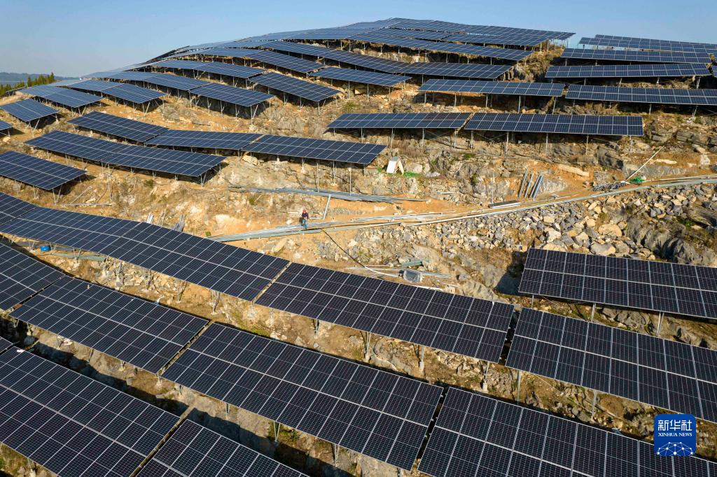 1月30日,工人在贵州省黔西市一光伏电站项目施工现场忙碌(无人机照片)。
