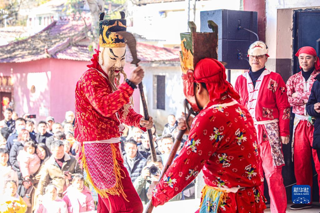 1月29日,在江西省抚州市南丰县莱溪乡黄满村,傩舞艺人在表演傩舞。