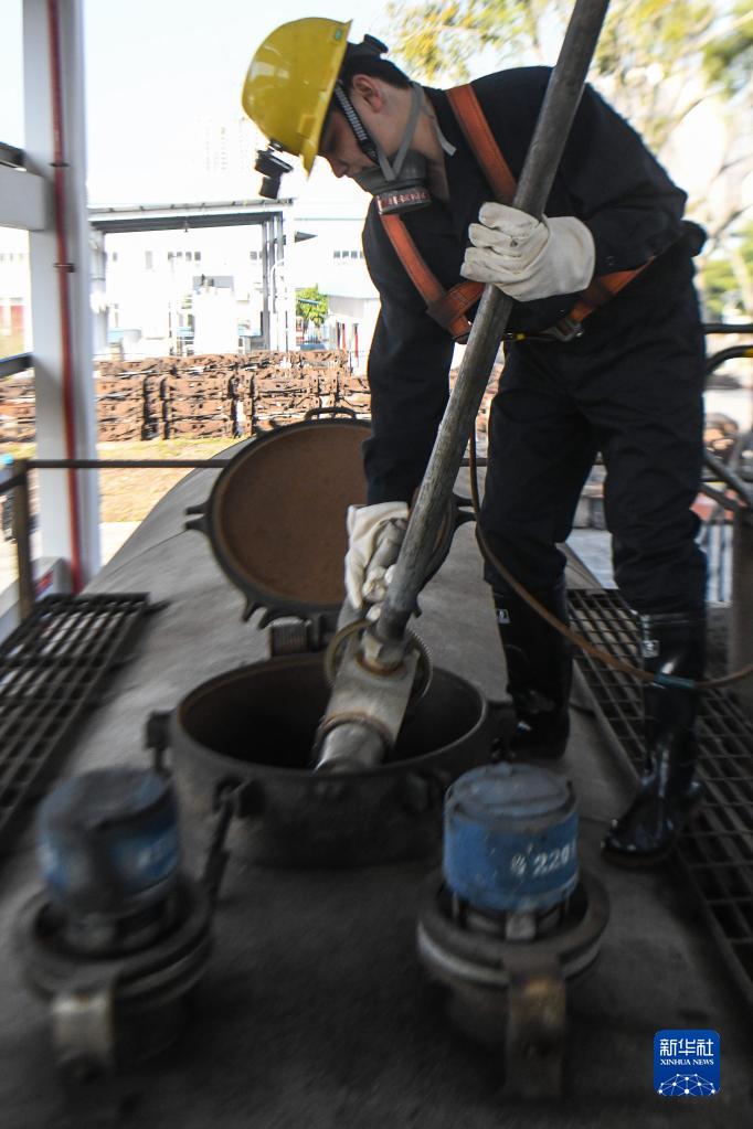 春运期间,通过西部陆海新通道发往全国各地的食用油、汽油类货物运输繁忙,油罐车运力剧增。在中国铁路南宁局集团有限公司南宁南车辆段,一批专门司职油罐车的洗罐工,在闷、湿、热的工作环境下对油罐车内部进行深度清洁,为油品安全保驾护航。